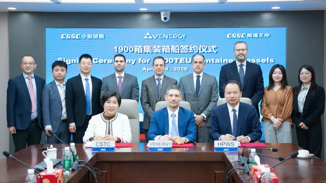 4月2日,中船黄埔文冲船舶有限公司蚁合合国船舶工业交易有限公司,与希腊航运公司Venergy Maritime在上海致密签署2+2艘“鸿鹄”型1900TEU支线集装箱船新订单。